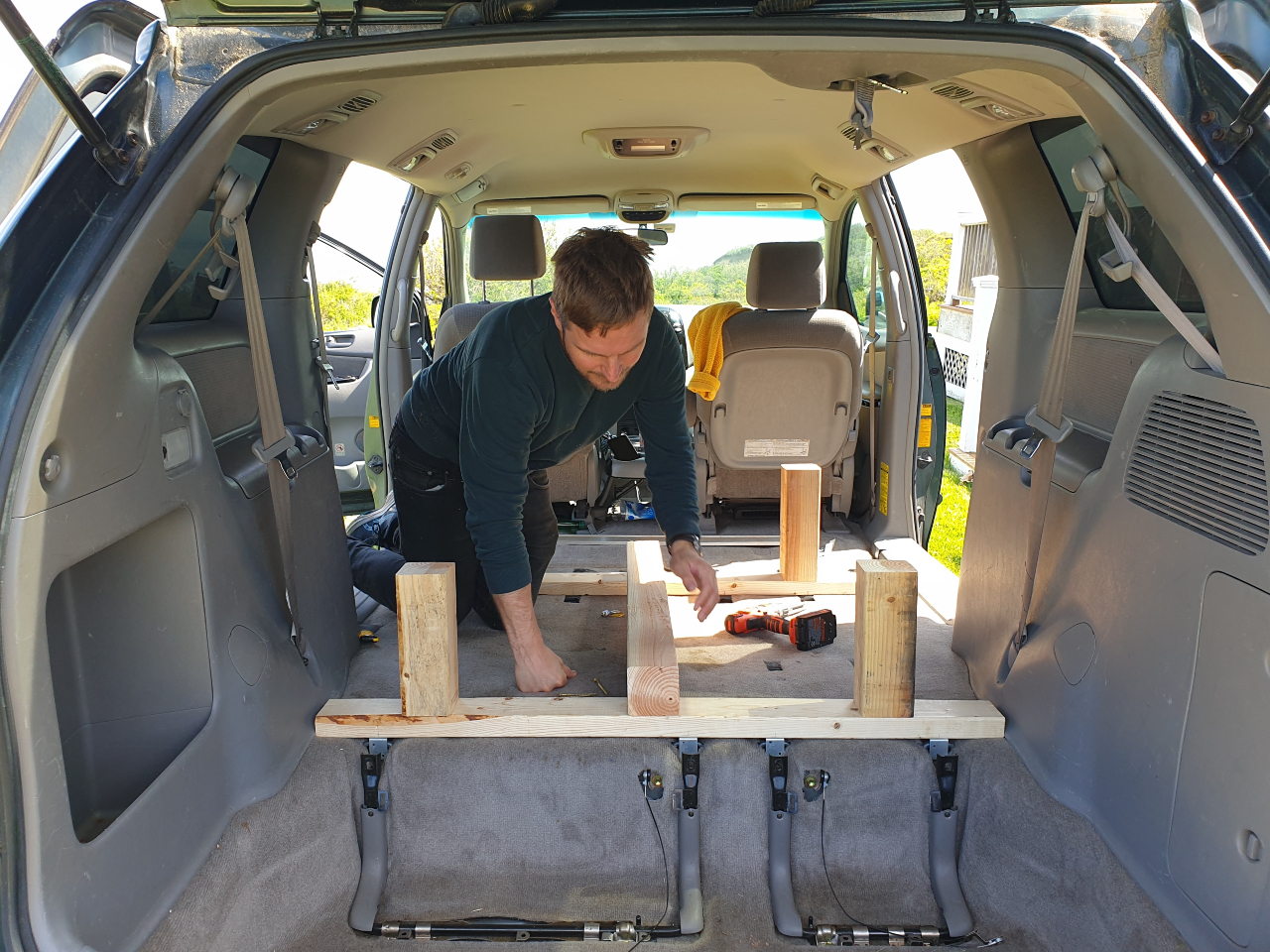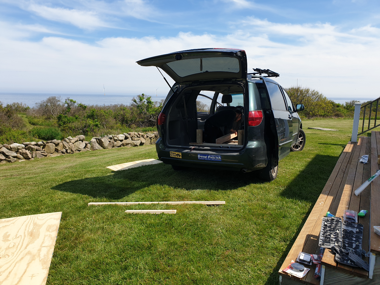 We spent the following day converting our van. We bought lots of wood in Boston at Home Depot, and George had all the necessary tools. Since we didn’t have a plan of how we wanted to convert it, we spent a lot of time discussing and trying to develop a good concept. We also drove to the hardware store three times because we constantly changed our plans and needed different parts. Finally, we finished the conversion and had a stable bed frame. We are very happy with the results!